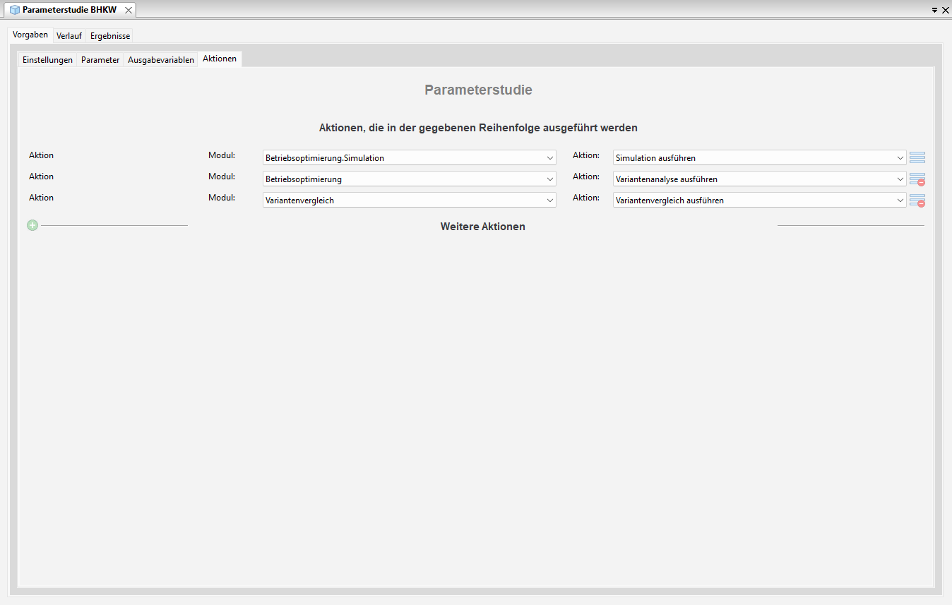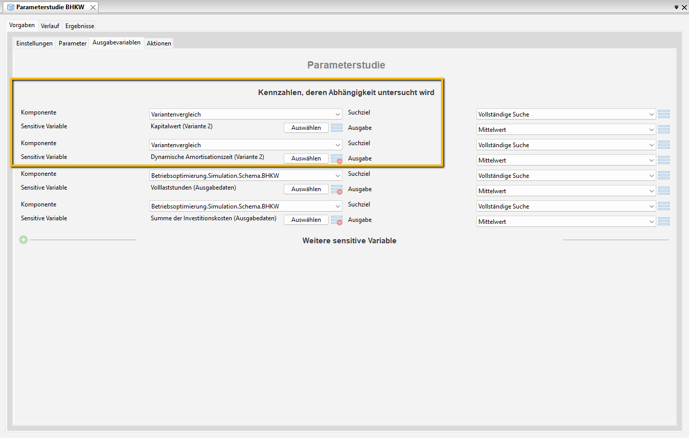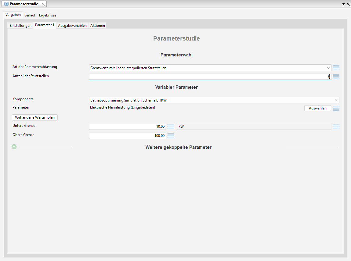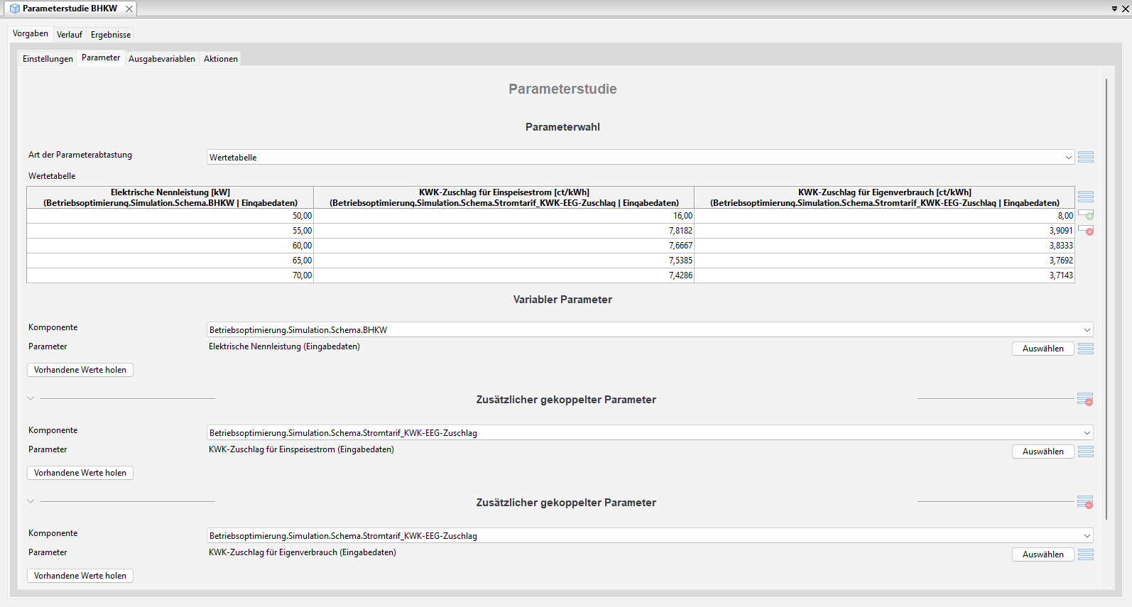 Im Zuge der Variation des führenden variablen Parameters (z. B. Elektrische Nennleistung) können auch andere Parameter parallel variiert werden. Dies ist zum Beispiel sinnvoll, wenn der Wirkungsgrad von der Nennleistung der Anlage abhängig ist. Wenn zum Beispiel der elektrische Wirkungsgrad mit steigender Größe des BHKW wächst, kann in der Parameterstudie als Zusätzlicher gekoppelter Parameter der Elektrische Nennwirkungsgrad ausgewählt werden.