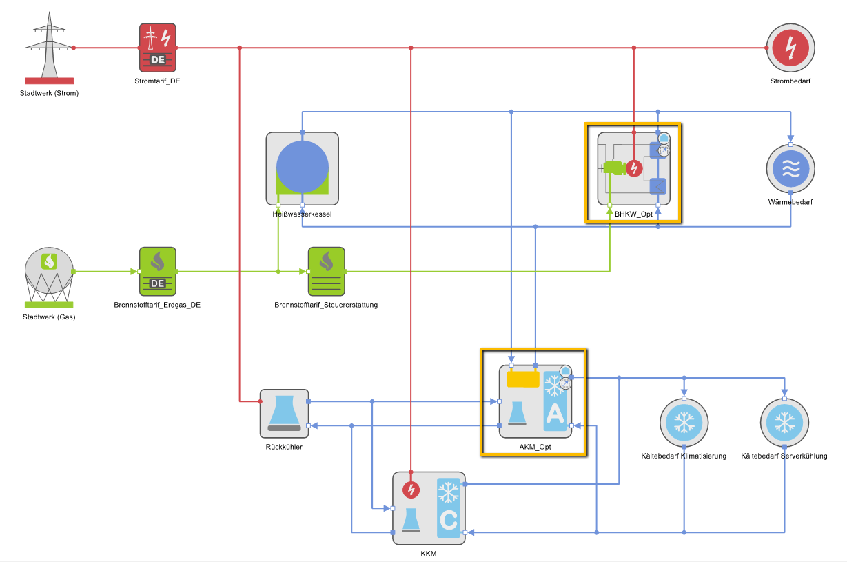 Die einfachste Möglichkeit, die Anlagengröße zu optimieren, ist die Strukturoptimierung. Sie bietet sich insbesondere dann an, wenn mehrere Anlagen simultan optimiert werden sollen. Die Strukturoptimierung ist im Artikel Funktionsweise der Strukturoptimierung detailliert beschrieben. Das Tutorial Strukturoptimierung der Kraft-Wärme-Kopplung demonstriert, wie die optimalen Anlagengrößen für eine Absorptionskältemaschine und ein BHKW gefunden werden.
