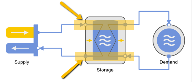 The Storage with bypass option allows a bypass of the storage tank. Only either loading or unloading is possible within one time step. The circuitry is shown on the top right-hand side.
